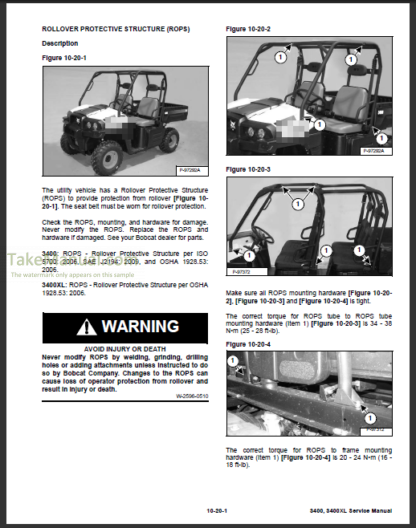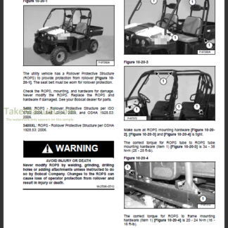 Repair Manual For Bobcat 3400 Utility Vehicle. Illustrations, instructions, diagrams for step by step remove and install, assembly and disassembly, service, maintenance, inspection, repair, troubleshooting, tune-up.
