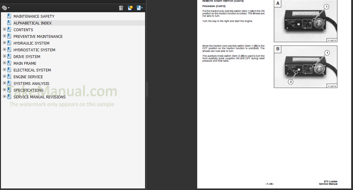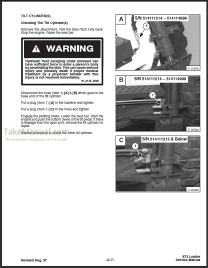 Repair Manual For Bobcat 873 Skid Steer Loader. Illustrations, instructions, diagrams for step by step remove and install, assembly and disassembly, service, maintenance, inspection, repair, troubleshooting, tune-up.