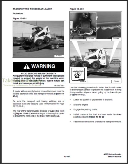 Repair Manual For Bobcat A300 Skid Steer Loader. Illustrations, instructions, diagrams for step by step remove and install, assembly and disassembly, service, maintenance, inspection, repair, troubleshooting, tune-up.