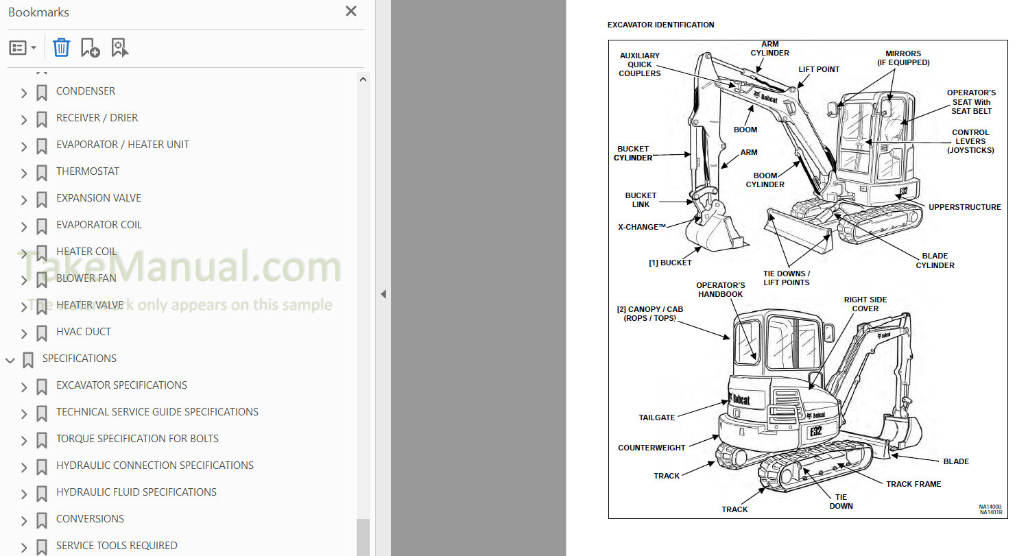 Factory Service Manual For Bobcat Compact Excavator. Manual Contains Illustrations, Instructions, Diagrams For Step By Step Remove And Install, Assembly And Disassembly, Service, Inspection, Repair, Troubleshooting, Tune-Ups.