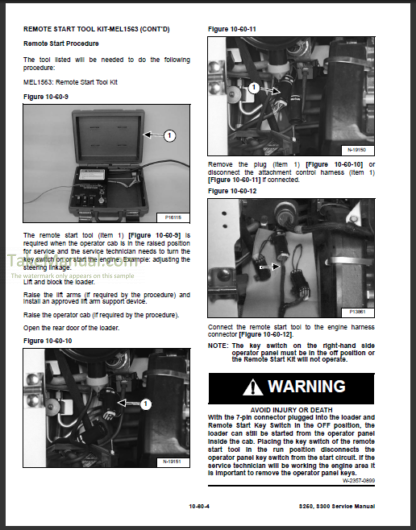 Repair Manual For Bobcat S250, S300 Skid Steer Loader. Illustrations, instructions, diagrams for step by step remove and install, assembly and disassembly, service, inspection, repair, troubleshooting, tune-up.