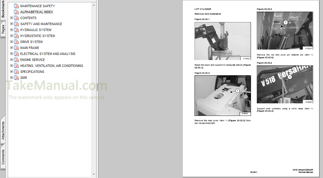 Repair Manual For Bobcat V518 VersaHANDLER. Illustrations, instructions, diagrams for step by step remove and install, assembly and disassembly, service, maintenance, inspection, repair, troubleshooting, tune-ups.