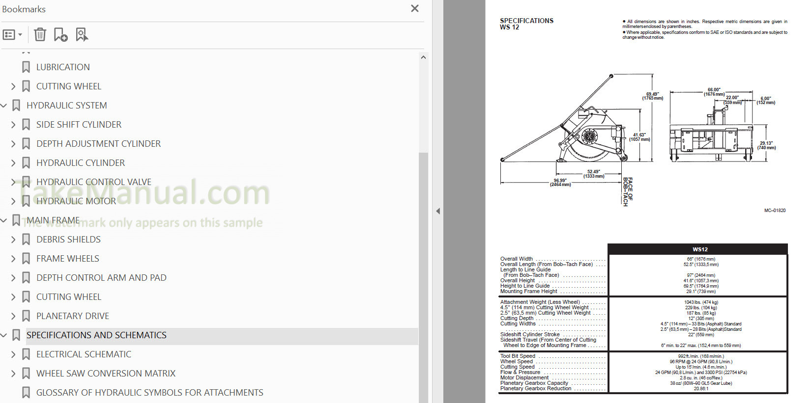 Factory Service Manual For Bobcat Wheel Saw. Manual Contains Illustrations, Instructions, Diagrams For Step By Step Remove And Install, Assembly And Disassembly, Service, Inspection, Repair, Troubleshooting, Tune-Ups.