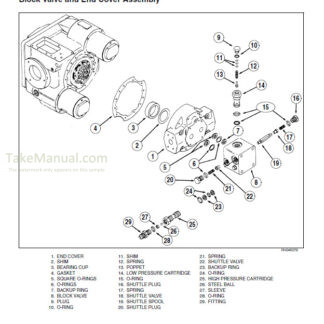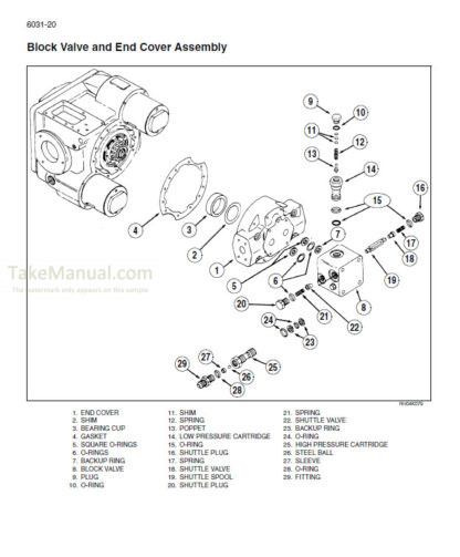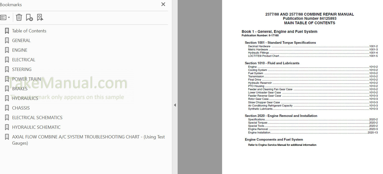 The Factory Service Manual for the combine. Includes detailed illustrations, instructions, and diagrams that facilitate step-by-step processes for the removal and installation, assembly and disassembly, servicing, inspection, repair, troubleshooting, tune-ups.