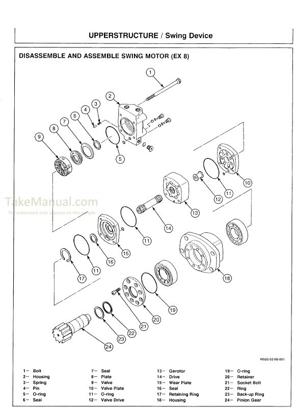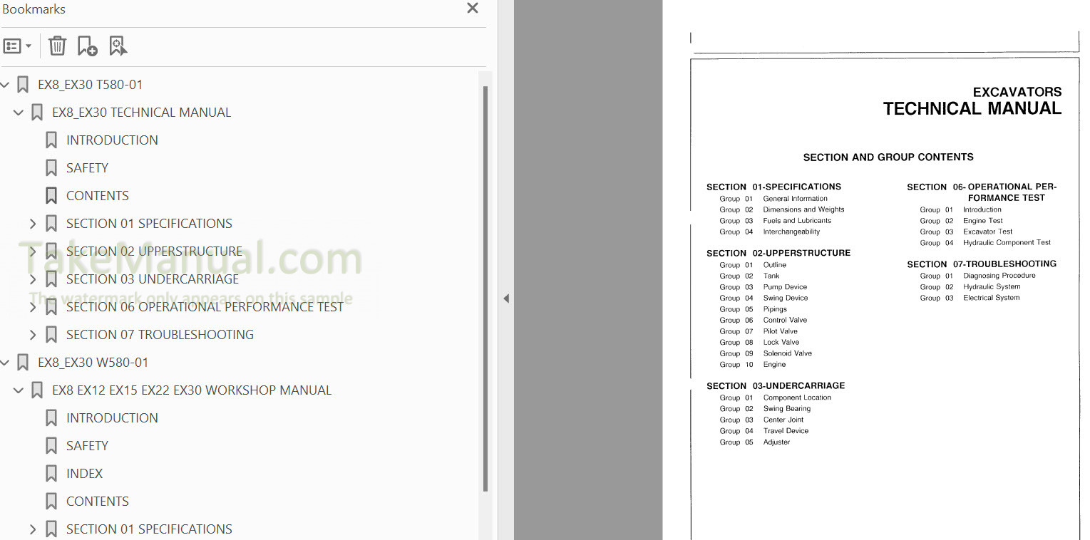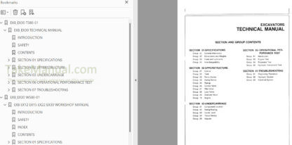 The Factory Workshop Manual for the Hitachi excavator. Includes detailed illustrations, instructions, and diagrams that facilitate step-by-step processes for the removal and installation, assembly and disassembly, servicing, inspection, repair, troubleshooting, tune-ups.